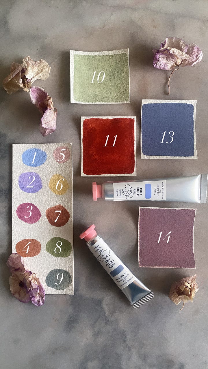 As you know I’m focusing on remaking my existing colors in gouache. I had a few request to remake other colors so if you would like to pre-order other colors but can’t find your favourite in the current selection, just write down the color you want in the checkout note and we’ll make it happen. You can select “Custom Color 10ml or 20ml” in the drop down menu, easy peasy! You can browse earlier watercolor palettes for inspiration and reference on my Instagram highlights or your own Tiny Clouds collection :)